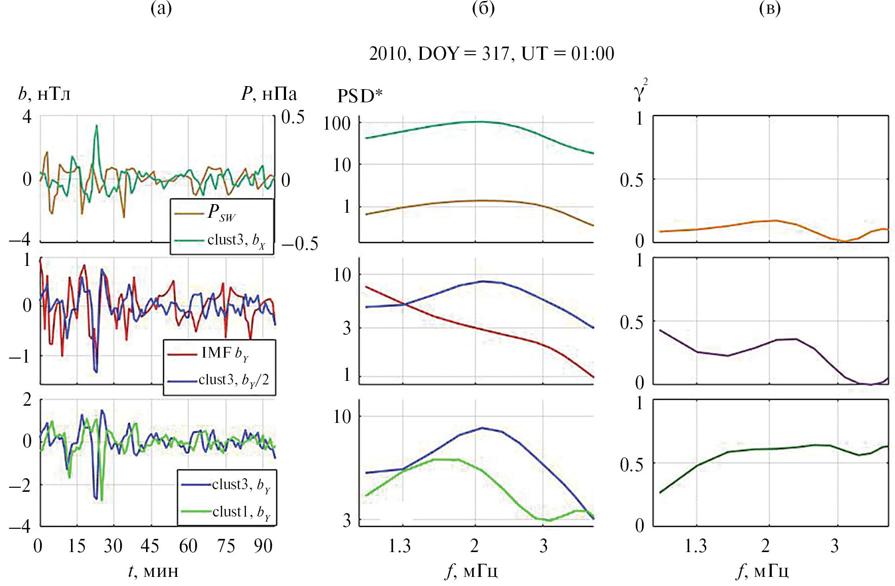 Рис. 3. Пример пульсаций магнитного поля, наблюдавшихся 13.XI.2010 (день 317) по обе стороны магнитопаузы на спутниках Cluster-3 (NMS) и Cluster-1 (HLBL) (нижние панели), флуктуаций динамического давления солнечного ветра и BY-компоненты ММП (верхние и средние панели). На панели а показаны временные формы вариаций после высокочастотной фильтрации с частотой отсечки 0.8 мГц. На панели б представлены нормированные спектры PSD*, на панели в – спектральные когерентности.