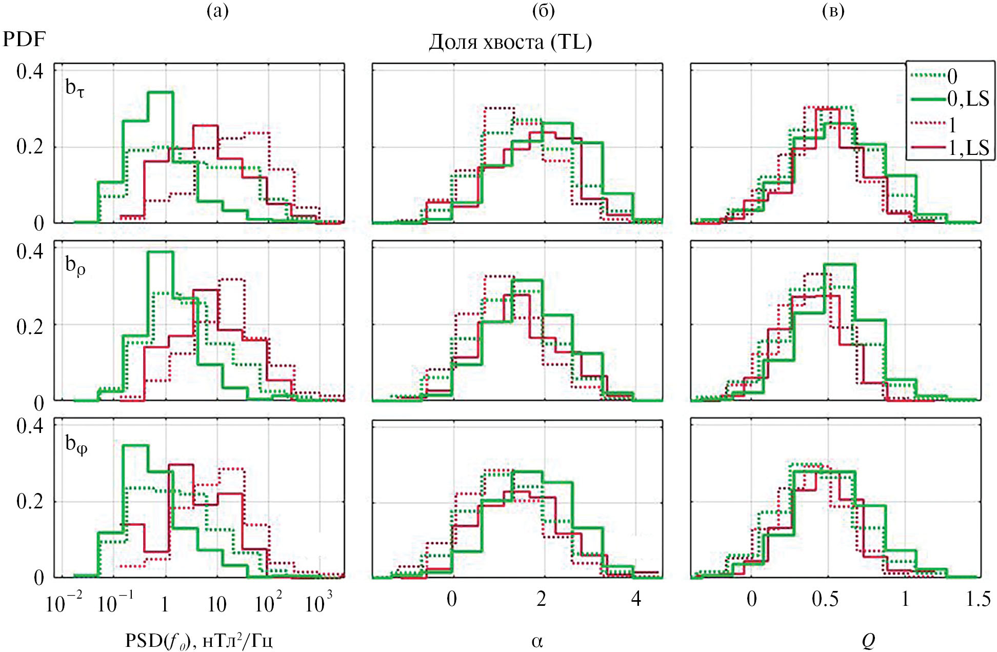 Рис. 5. Распределения по PSD(f0) (панель а), спектральному наклону α (панель б) и параметру Q (панель в) пульсаций групп 0 и 1, в том числе крупномасштабных (LS) для трех компонент магнитного поля в доле геомагнитного хвоста.