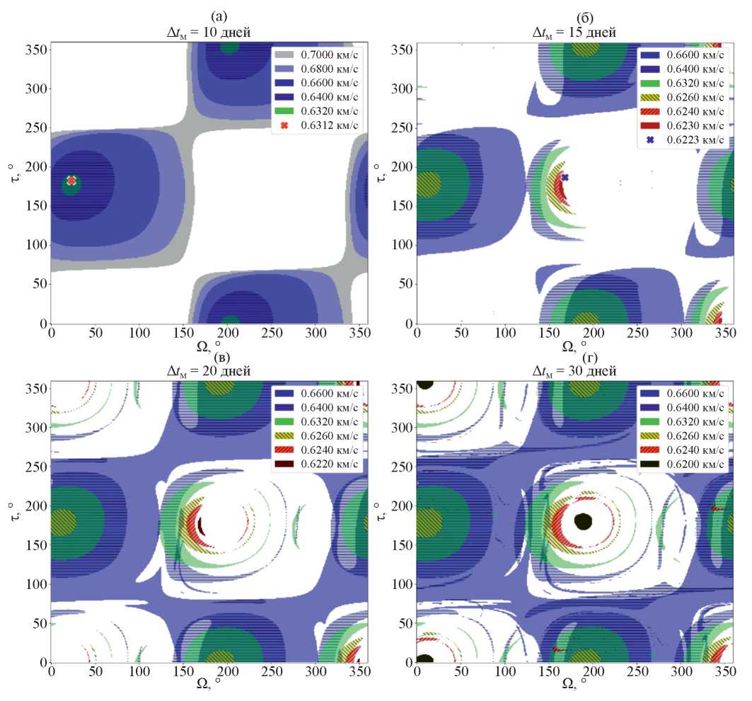 На рис. 2 приведены результаты расчета транзитных орбит для значений tM, равных 10, 15, 20 и 30 дням. Значения и t отложены по горизонтальной и вертикальной осям соответственно. Штрихованные области, соответствующие различным значениям VM, ограничивают комбинации и t, приводящие к транзитным орбитам за заданное время. Маркерами отмечены точки, соответствующие минимальным значениям VM. Когда принимает значения, равные 0° или 180°, начальная скорость направлена ортогонально плоскости . Комбинации (, t), приводящие к движению КА в противоположную от Земли сторону, принадлежат областям, заштрихованным на рис. 2а. При увеличении tM структура областей параметров, приводящих к транзитным орбитам усложняется, причем минимальные значения VM наблюдаются при сочетаниях и , соответствующих направлению «к Земле». Это объясняется тем, что при достаточном количестве времени, возникают траектории перехода в окрестность точки L2 через окрестность точки L1.