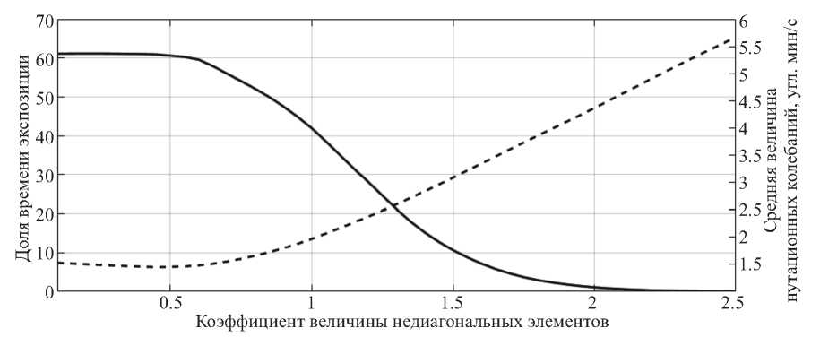 На рис. 3 видно, как доля времени экспозиции выходит на постоянное значение при недиагональных элементах тензора инерции примерно вдвое меньших, чем в (1). Это означает, что при таких величинах недиагональных элементов определяющими точность стабилизации факторами оказываются другие источники возмущения — внешние моменты и ошибки определения ориентации. Если же недиагональные элементы тензора инерции в (1) увеличить вдвое, требуемая ориентация оказывается практически недостижимой. Чтобы дополнительно проиллюстрировать полученные при численном моделировании и приведенные на рис. 3 результаты, обратимся к статье [31]. В исследовании [31] показано, что при наличии недиагональных элементов тензора инерции возникают неустранимые нутационные колебания, уровень которых примерно задается выражением