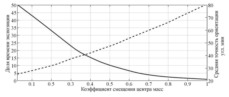 Вторым существенным фактором, влияющим на эффективность работы системы управления и требующим точной компоновки КА, является аэродинамический момент. Его воздействие становится особенно ощутимым на низкой орбите высотой 350 км (плотность атмосферы увеличивается примерно в 30 раз по сравнению с высотой 550 км). Здесь, в отличие от диагональных элементов, приводящих к неточности стабилизации КА, возникает ошибка в точности ориентации оси вращения. Для тензора инерции (1) получена зависимость точности ориентации КА (пунктирная линия на рис. 4) от смещения центра масс относительно центра давления, и доля времени, когда выполнены ограничения (сплошная линия). Смещение центра масс КА задается номинальным вектором с компонентами 3, 3, 10 мм в связанных осях, умноженным на коэффициент.
