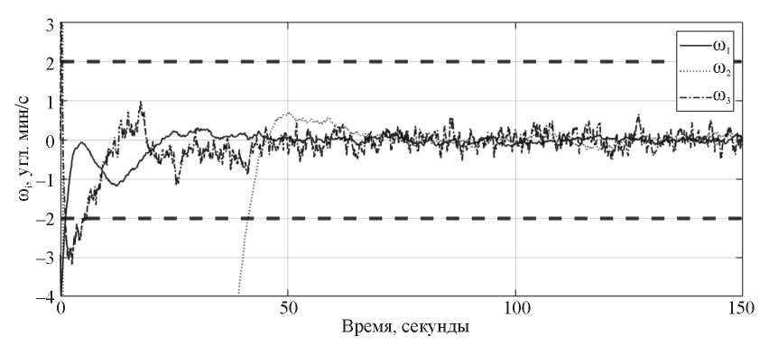 На рис. 6 приведен пример стабилизации КА с помощью маховика RWP015, работающего в начальный момент на 10 % от максимального кинетического момента.