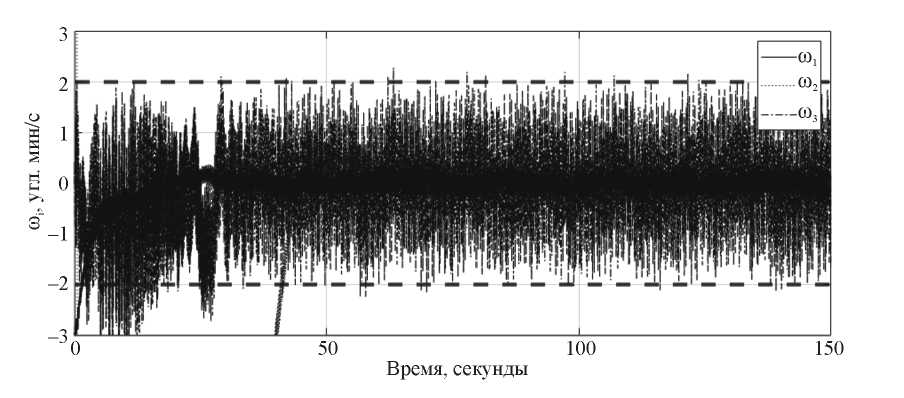 Для достижения необходимой точности с помощью представленных в табл. 2 маховиков требуется работать на уровне около 10 % от их максимального кинетического момента (рис. 6). При накопленном кинетическом моменте на уровне в половину максимального имеются лишь отдельные моменты времени, когда угловая скорость КА удовлетворяет ограничениям (рис. 7). Таким образом, при использовании маховиков в качестве системы стабилизации необходимо обеспечивать небольшие значения кинетических моментов маховиков во время съемки, что вполне возможно при использовании вспомогательной системы разгрузки, например, магнитных катушек.