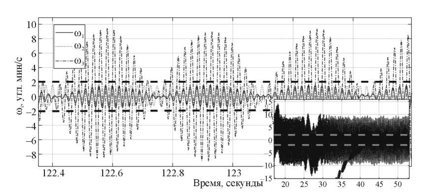 На рис. 2 на врезках выделен начальный переходный процесс. Видно, как на начальном этапе движения происходит одновременная раскрутка КА и гашение нутационных колебаний. Скорость вращения при этом должна поддерживаться в диапазоне 4.8…4.9 град/с. Примерно через 0.15 ч нутационные колебания подавляются, после этого продолжается раскрутка КА с медленным дрейфом оси вращения в инерциальном пространстве (алгоритм переориентации не работает). После достижения требуемой скорости вращения (примерно через полчаса) включается алгоритм переориентации. В результате резко повышается уровень нутационных колебаний, который постепенно снижается, пока аппарат не выходит на установившийся режим движения примерно через час после начала движения.