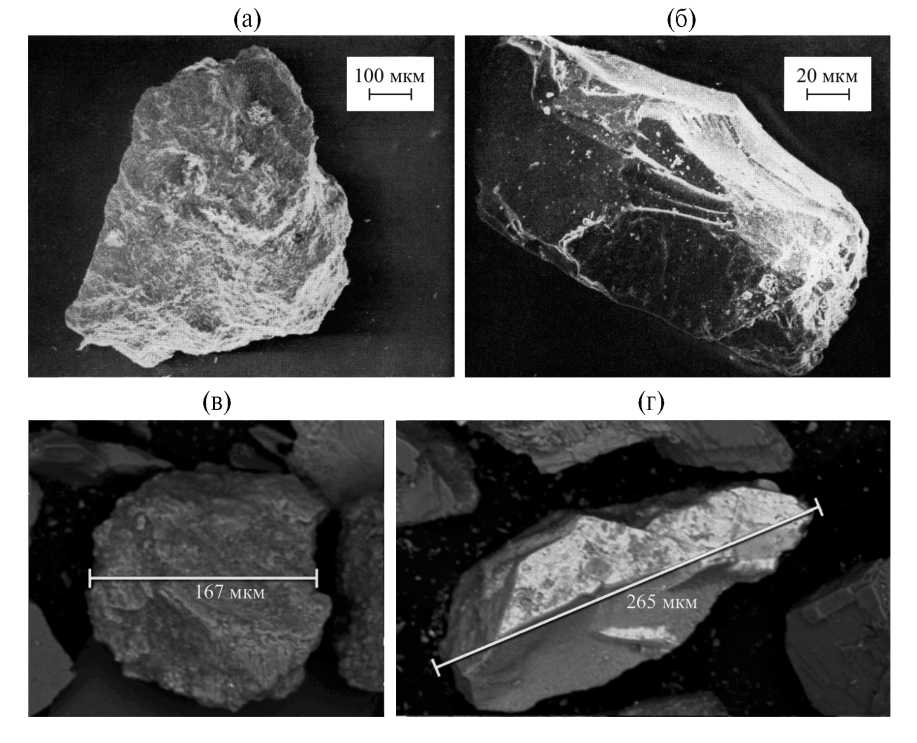 Были проведены исследования морфологии частиц приготовленных композиций. Микрофотографии получены на электронном микроскопе TESCAN VEGA3-XMU. Было установлено, что морфология отдельных частиц порошковых композиций с фракционностью 0…100 мкм, 50…100 мкм и 100…140 мкм имеет такой же характер, что и естественный лунный реголит (рис. 1а,б). В приготовленных композициях присутствуют частицы, как близкие по форме к сферическим (рис. 1в), так и остроугольные и вытянутые частицы (рис. 1г).