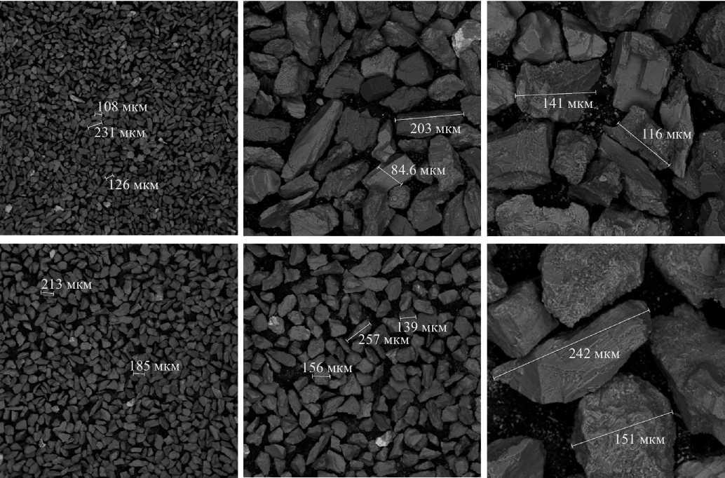Рис. 2. Морфология частиц. Вверху: порошковая композиция ГД 50-100 с увеличениями в 55, 300 и 500 раз, слева направо. Внизу: порошковая композиция ГД 100-140 с увеличением в 55, 300 и 600 раз, слева направо. Размерными линиями отмечены частицы с размерами главных осей, превышающими заданную верхнюю границу фракционности.