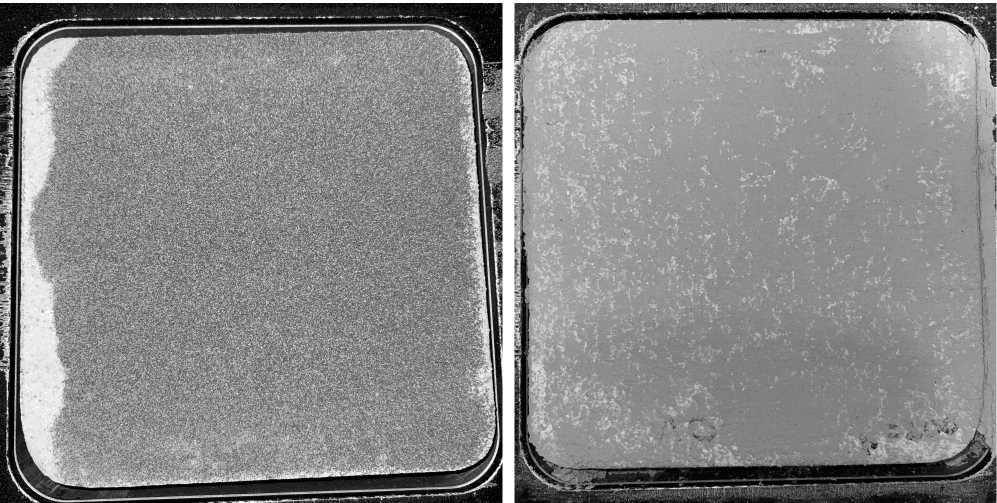 Рис. 8. Слои порошка на платформе построения из ГД 100-140 (слева) и ЛДР 0-100 (справа).