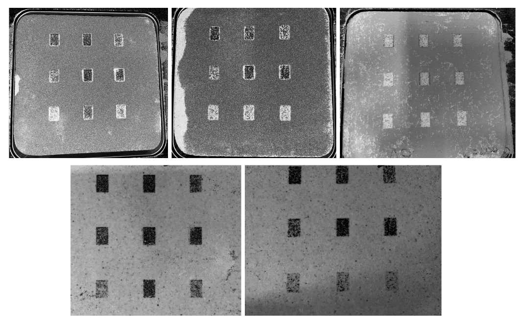 Рис. 9. Верхний ряд: фотографии сплавления однослойных образцов из порошковых композиций ГД 50-100, ГД 100-140, и ЛДР 0-100 (слева направо). Нижний ряд: фотографии однослойных образцов из ГД 50-100, ГД 100-140 после удаления остаточного порошка вне зон сплавления.