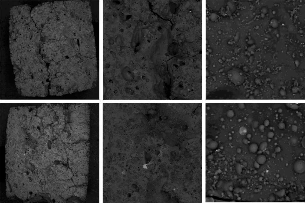 Рис. 11. Микрофотографии поверхности образцов для композиции ГД 100-140 на режимах СЛС с параметрами 60 Вт, 125 мм/с, 16.8 Дж/мм3 (вверху) и 80 Вт, 150 мм/с, 18.7 Дж/мм3 (внизу); увеличение в 35, 100, 2300 раз (слева направо).