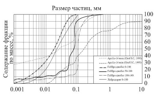 При этом следует отметить, что предложенные на основе проведенных экспериментов порошковые композиции незначительно отличаются по своим гранулометрическим характеристикам от реального реголита. На рис. 14 представлено сравнение интегральных гранулометрических распределений для всех образцов реального реголита, доставленных в экспедиции Apollo-16 [19], и порошковых композиций, изученных в настоящей статье. Распределения для обеих оптимальных для СЛС композиций, ГД 50-100 и ГД 100-140, находятся в пределах кривых максимальных и минимальных границ распределений реального реголита.