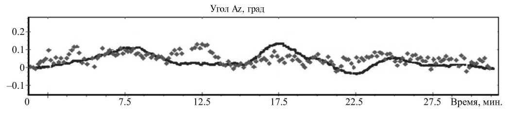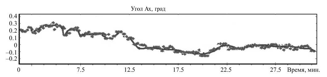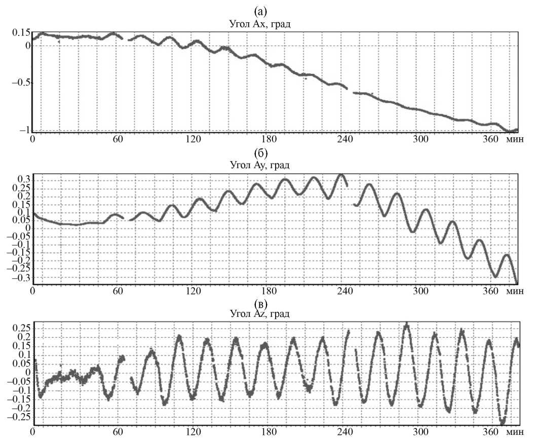 Как правило, среднее значение углов отличается от указанных на величину, не превышающую 0.1°. Большие отличия могут быть при возникновении помехи на пути сигнала, например, из-за сильного дождя. Если на пути сигнала к спутнику действуют помехи, с помощью разработанных фильтров такой сигнал отбраковывается и в расчётах углов не участвует. Несколько сложнее задача при возникновении помехи на пути сигналов от КА к приёмной станции. В этом случае изменение всех сигналов имеет один знак и близкие амплитуды, что позволяет построить фильтр и вовремя прекратить управление ориентацией по углам.