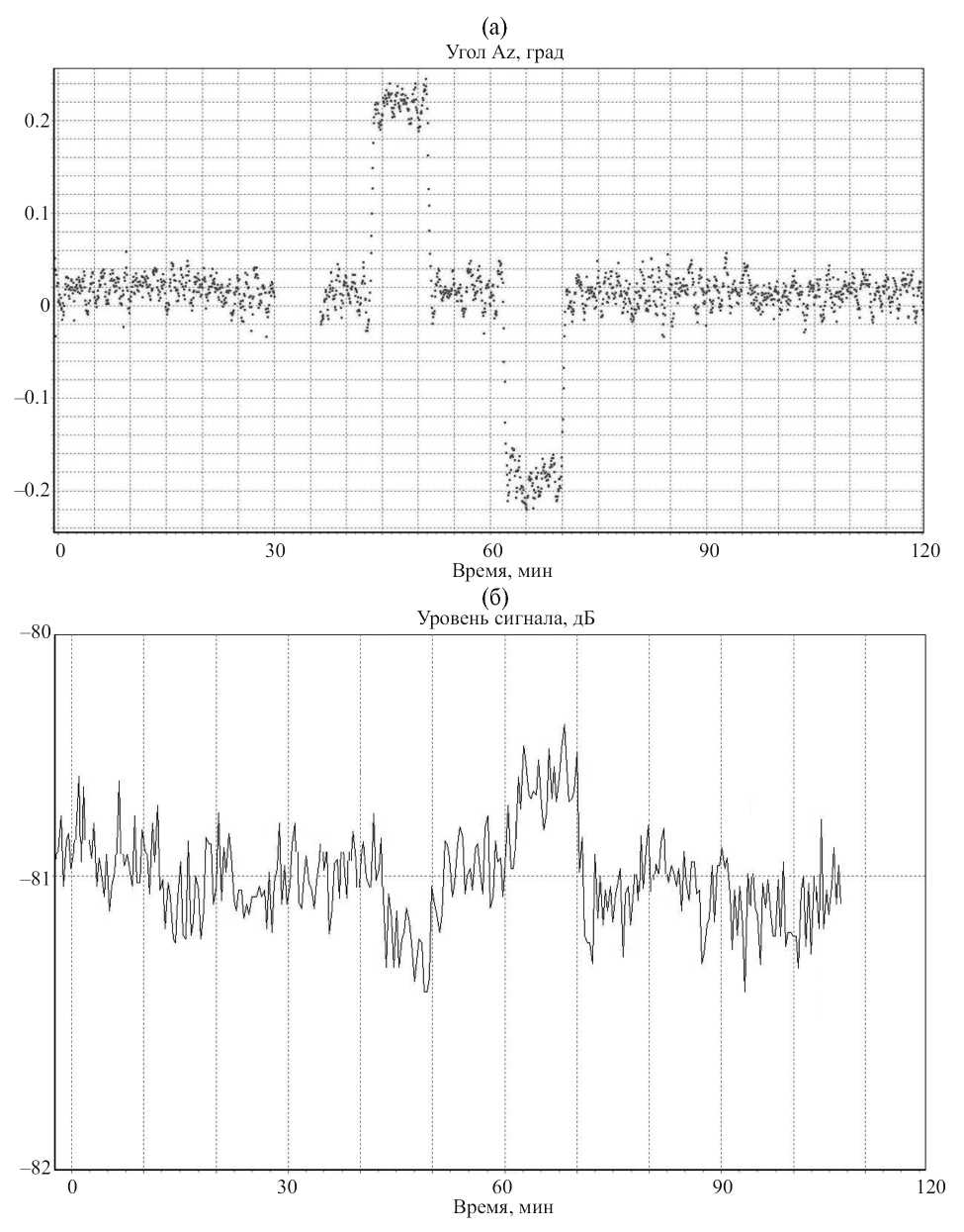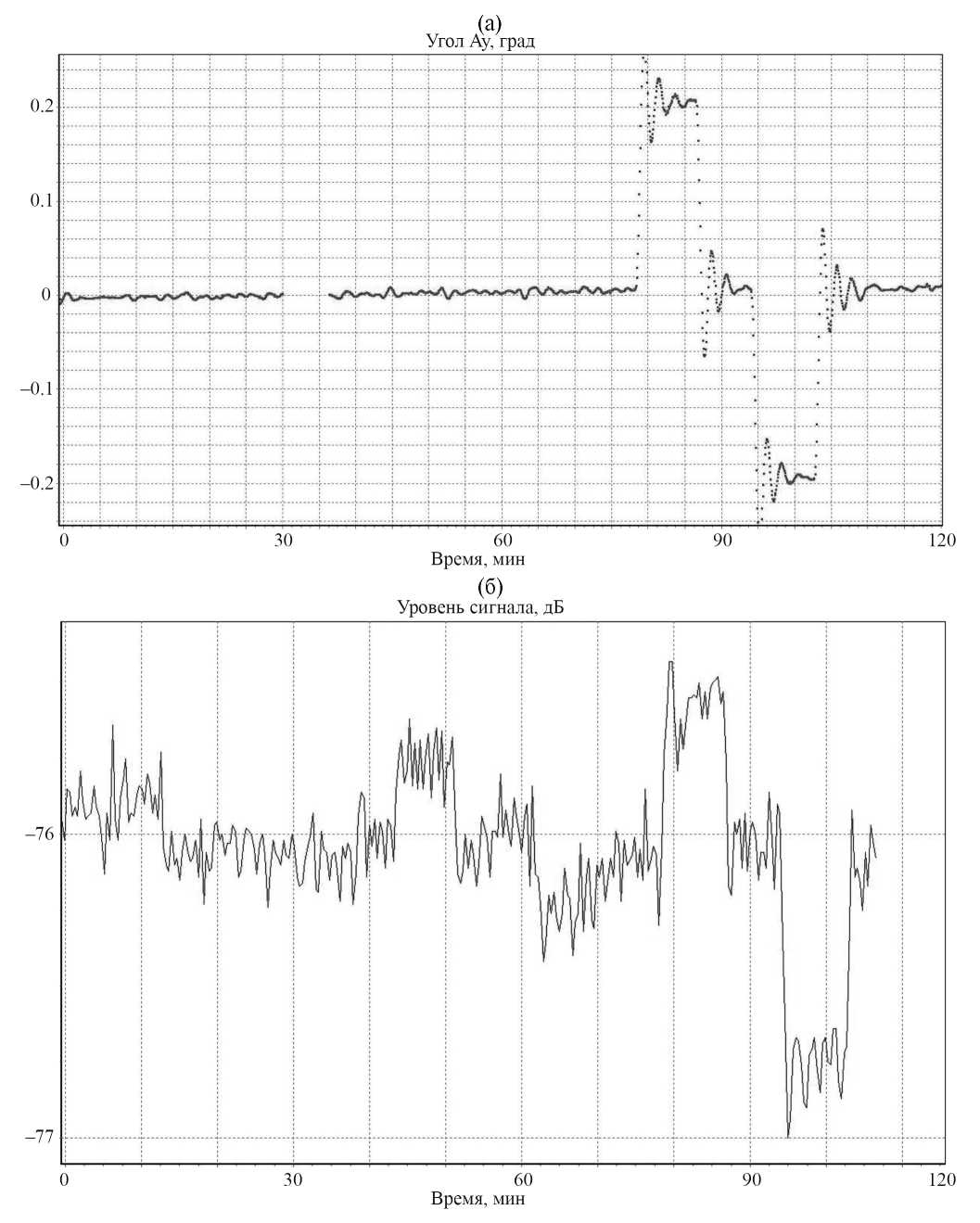 В процессе исследований была выявлена зависимость мощности сигналов от положения КА на орбите. Степень зависимости для разных сигналов различна, но некоторые довольно чувствительны даже к небольшому движению спутника относительно рабочей точки (не более 0.05°) — рис. 4.