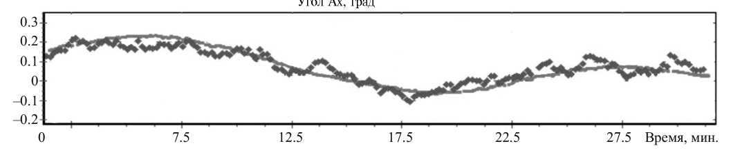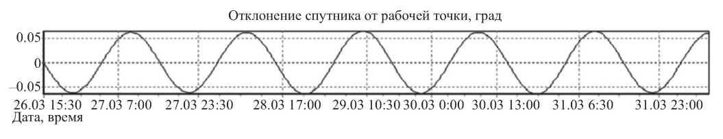 Опыт эксплуатации КА «Ямал» показывает, что, как правило, после 4 ч управления в режиме «Прогноз» погрешность ориентации превышала максимально допустимую величину 0.3° (рис. 1). Для управления в окрестности местной полуночи, на интервалах кратковременного отсутствия измерений звездных датчиков из-за трудности опознавания звезд, прохождения теневых участков орбиты указанной длительности 4 ч полета достаточно.
