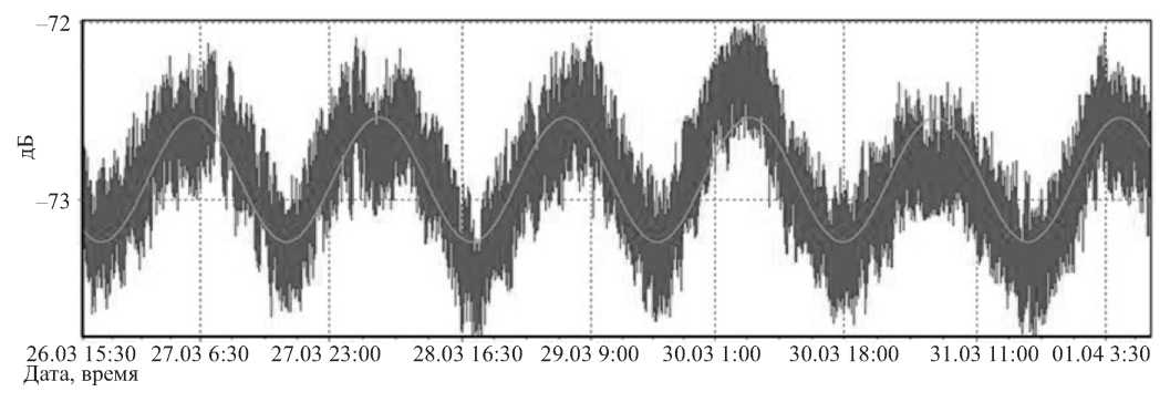 Полученное описанным способом решение представлено на рис. 5 в виде кривой светло-зеленого цвета. Расчётные величины равны: A = 0.3489, φ = –0.6178, h = –72.8866, СКО = 0.1857, период равен 23.98 ч.