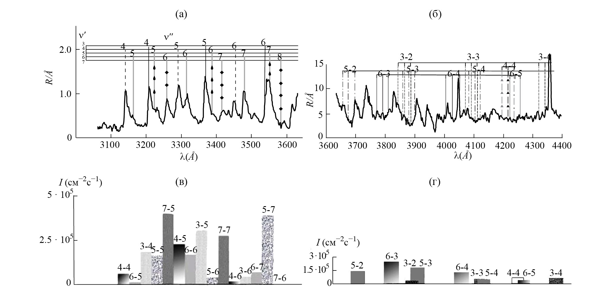 Рис. 4. Панель (а) – экспериментальные данные, полученные со спектрографа EbertFastie в диапазоне 300–370 нм (обсерватория Китт-Пик); (б) – экспериментальные данные, полученные со спектрографа EbertFastie в диапазоне 360–440 нм; (в) –рассчитанные значения интегральной светимости полос Герцберга I для средних широт Земли; (г) – рассчитанные значения интегральной светимости полос Чемберлена для средних широт Земли