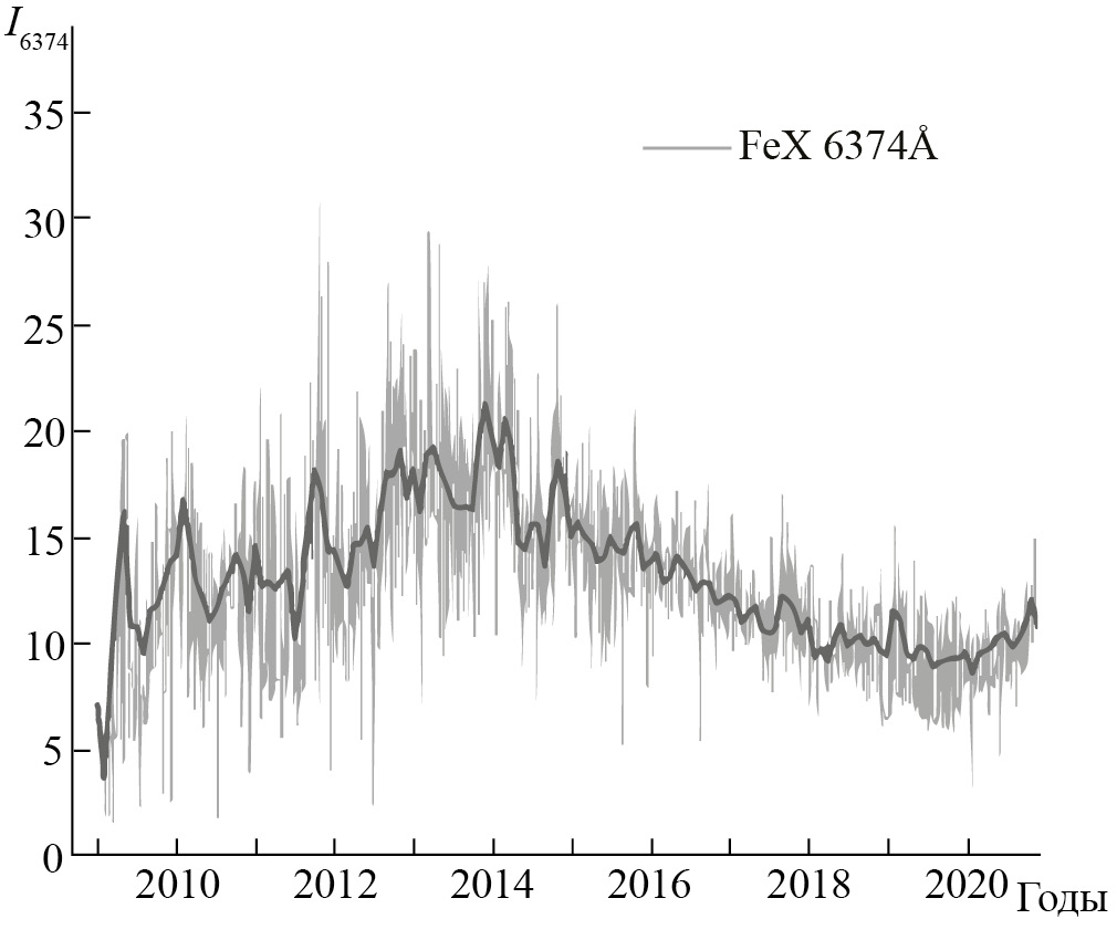В настоящей работе использовались спектральные данные красной корональной линии λ = 6374 Å (FeX), полученные за период 24-го цикла СА на внезатменном коронографе системы Лио ГАС ГАО РАН [18]. За данный период (2010–2019 гг.) в среднем за год корональных наблюдений было 180 дней. Надо отметить, что в 24-м цикле СА было наибольшее число дней корональных наблюдений по сравнению с другими циклами СА [18]. Для фотографирования спектра короны использовались цифровые камеры Canon EOS 450D и 600D. В результате обработки, в соответствии с программой по “Службе Солнца”, вычисляют интенсивности корональных линий (I5303 и I6374) в абсолютных единицах (абс. ед.), выраженные в миллионных долях энергии, заключающейся в интервале шириной 1 Å непрерывного спектра центра Солнца, которые измеряются на расстоянии 40” от фотосферы Солнца [6]. На рис. 1 представлен временной ряд 24-го цикла спектральной короны I6374 (абс. ед.) по этим данным. Спектральные наблюдения Горной астрономической станции ГАО РАН позволяют делать измерения I6374 вдоль линии до высоты 6' (1.38 Rʘ).