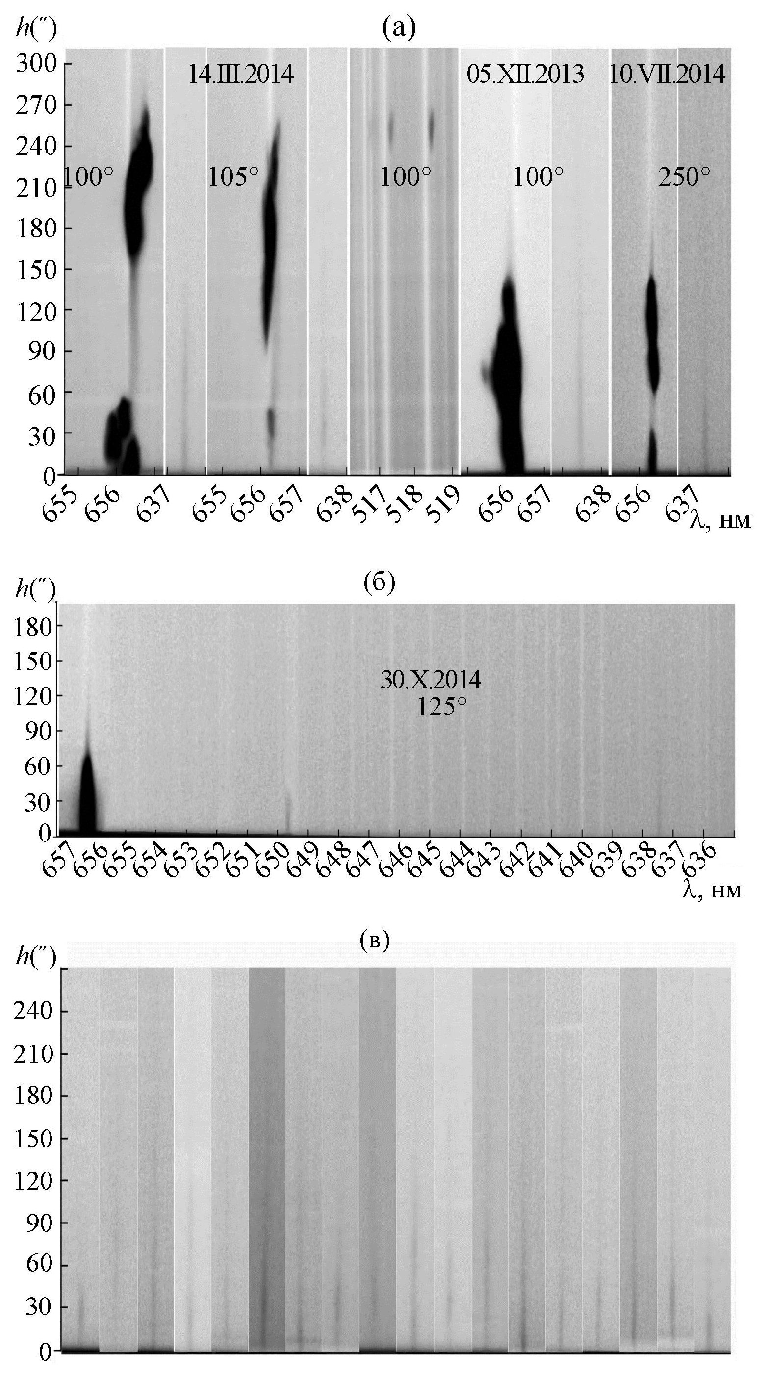 Рис. 2. Панель (а) – примеры неоднородной корональной линии λ = 6374 Å во время излучения эруптивного протуберанца типа “серджа” в линии Hα (λ = 6563 Å) и в линии излучения триплета Mg (λ = = 5167 Å, λ = 5173 Å, λ = 5184 Å). Указана дата и позиционный угол; панель (б) – пример спектра с излучением в корональной линии λ = 6374 Å, Hα (λ = = 6563 Å) и Ва (λ = 6497 Å), где 125° – позиционный угол; панель (в) – примеры неоднородностей вдоль корональной линии λ = 6374 Å над активными областями около лимба