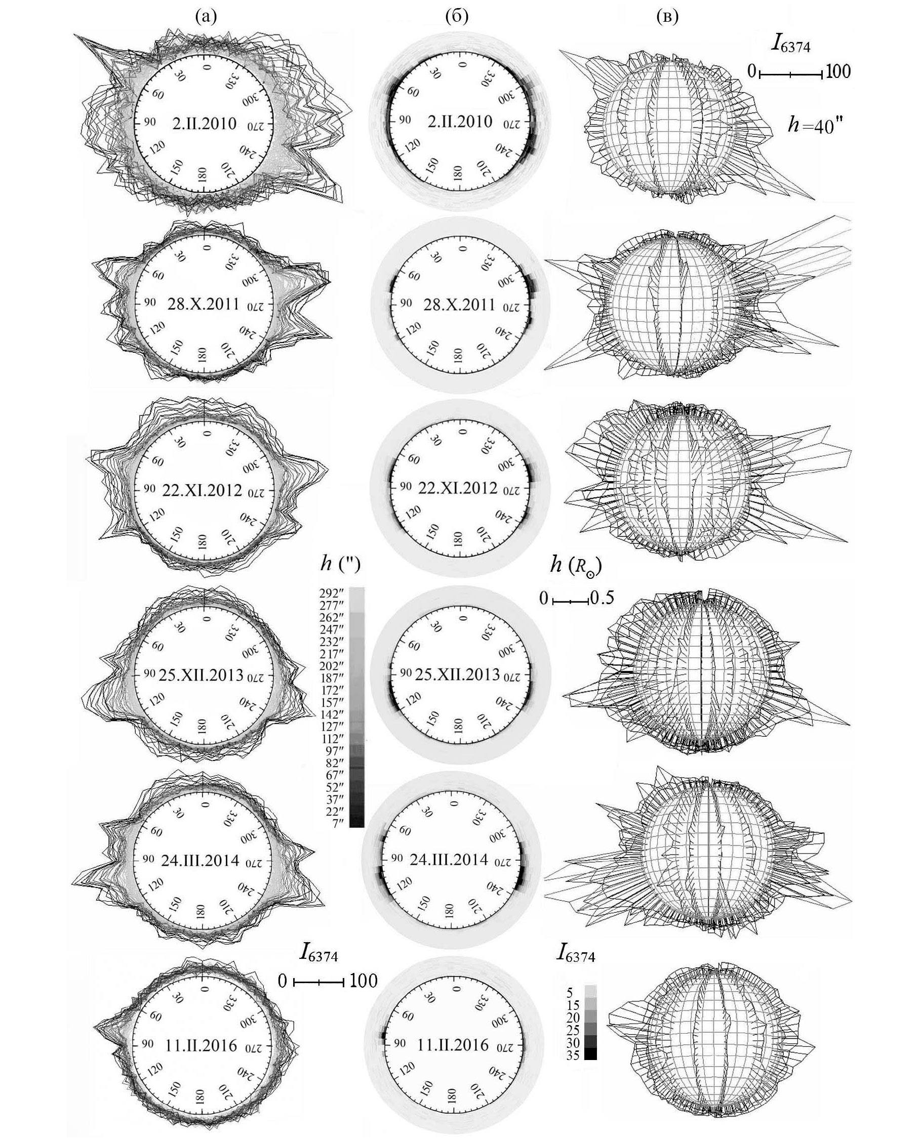 На рис. 3 показаны примеры ежедневных корональных карт на ветви подъема, в максимуме, и на ветви спада 24-го цикла СА, где подобраны дни с разной конфигурацией спектральной короны. Для наглядности разные виды карт показаны для одного и того же дня. На данных картах (рис. 3а) видно, что в большинстве случаев до высоты h = 70” изолинии I6374 могут менять свою конфигурацию с высотой. Чем меньше высота, тем больше хаотичность изолиний. Так же, как и на картах для I5303 [19] наблюдается смещение максимума изолиний I6374, но оно не такое отчетливое и встречается реже. Например, на карте за 2.II.2010 в SW (англ. Southwest) квадранте до h = 100” максимум хоть и имеет небольшие скачки, но он ближе к полюсу, а затем он на 10° отклоняется к экватору. В работе [21] исследовалось отклонение от радиального направления корональных лучей в белом свете в зависимости от фазы цикла СА, с использованием данных широкоугольного коронографа LASCO C2 (англ. Large Angle and Spectrometric Coronagraph) космической обсерватории SOHO (англ. Solar and Heliospheric Observatory). Как и для корональных лучей в белом свете, максимумы интенсивности спектральной линии λ = 6374Å на разных высотах (“красные лучи”) имеют отклонения в направлении более высоких или более низких широт. Таким образом, построенные карты наглядно показывают отклонение “красного луча” с высотой от радиального направления, но больших углов наклона до 25–35°, как для корональных лучей в белом свете [21], не наблюдается.