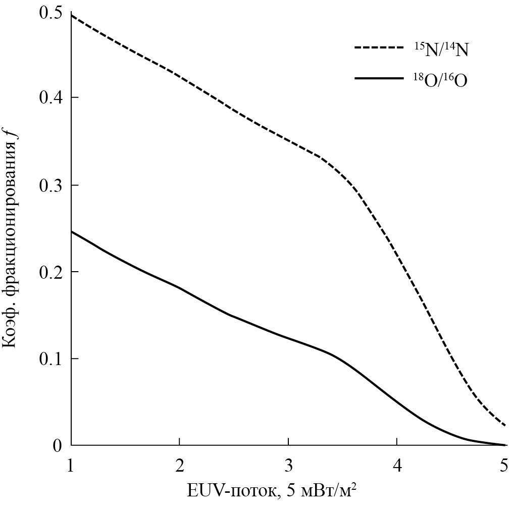 На рис. 3 показаны коэффициенты фракционирования изотопов азота15N/14N и кислорода18O/16O за счет потерь, вызванных СВ, в зависимости от солнечного EUV-излучения и в отсутствие собственного магнитного поля. Из рисунка следует, что потери, вызванные СВ, наиболее эффективно фракционируют изотопы при малом EUV-излучении. С ростом этого излучения ионосфера (т. е. нижняя граница индуцированной магнитосферы) расширяется, а коэффициент фракционирования ее изотопов стремиться к нулю. Расширение собственной магнитосферы (при наличии собственного магнитного поля) также уменьшает коэффициент фракционирования.
