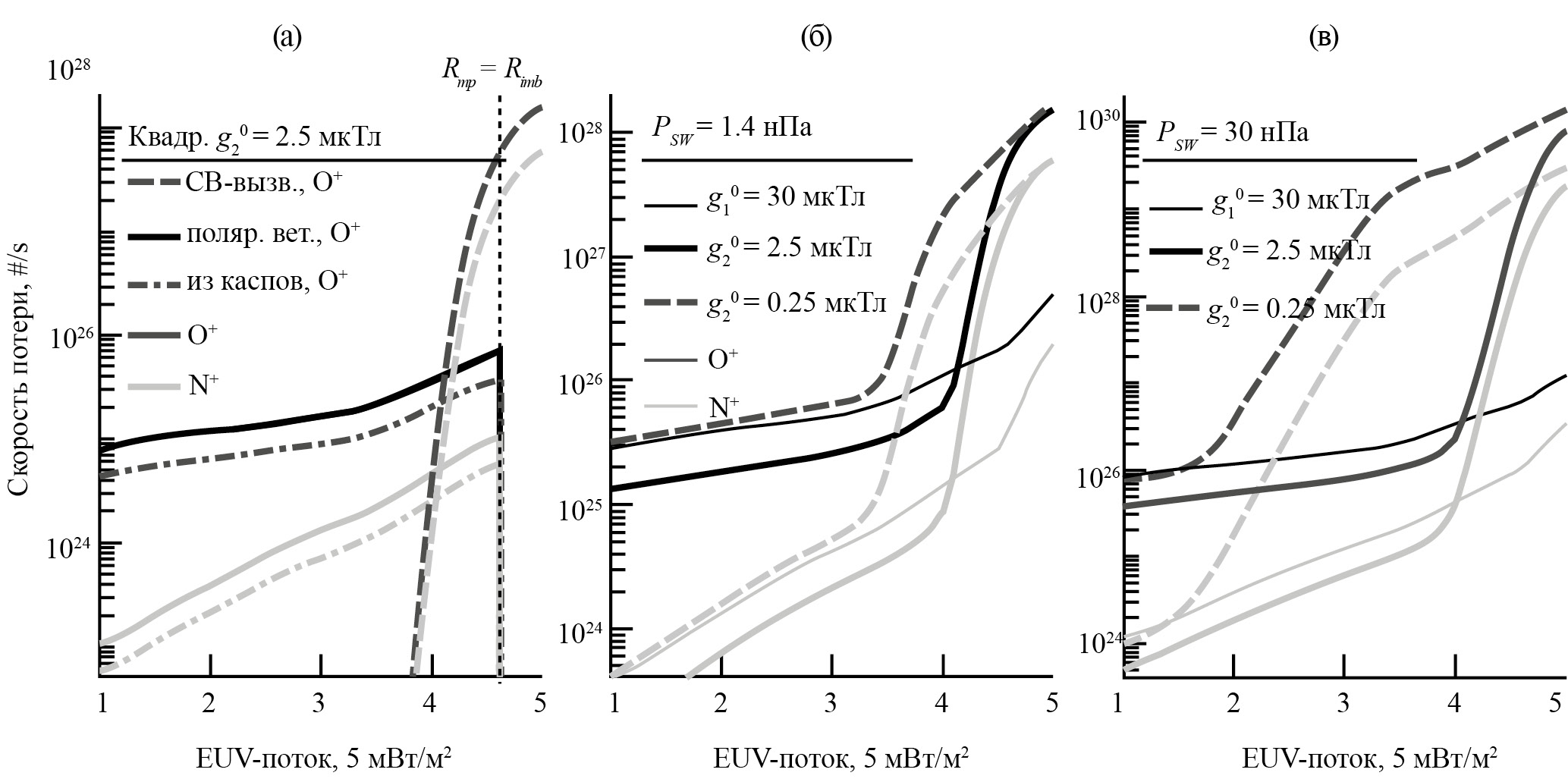 На рис. 4б, в показаны суммарные скорости потери O+ и N+ в зависимости от EUV-потока для современного магнитного поля с мкТл (тонкие кривые) и в момент инверсии с мкТл (толстые кривые) и мкТл (пунктирные кривые) при давлении СВ 1.4 нПа (б) и 30 нПа (в). Из рисунка следует, что cлабое магнитное поле, а также высокое давление СВ увеличивают ионосферные потери.