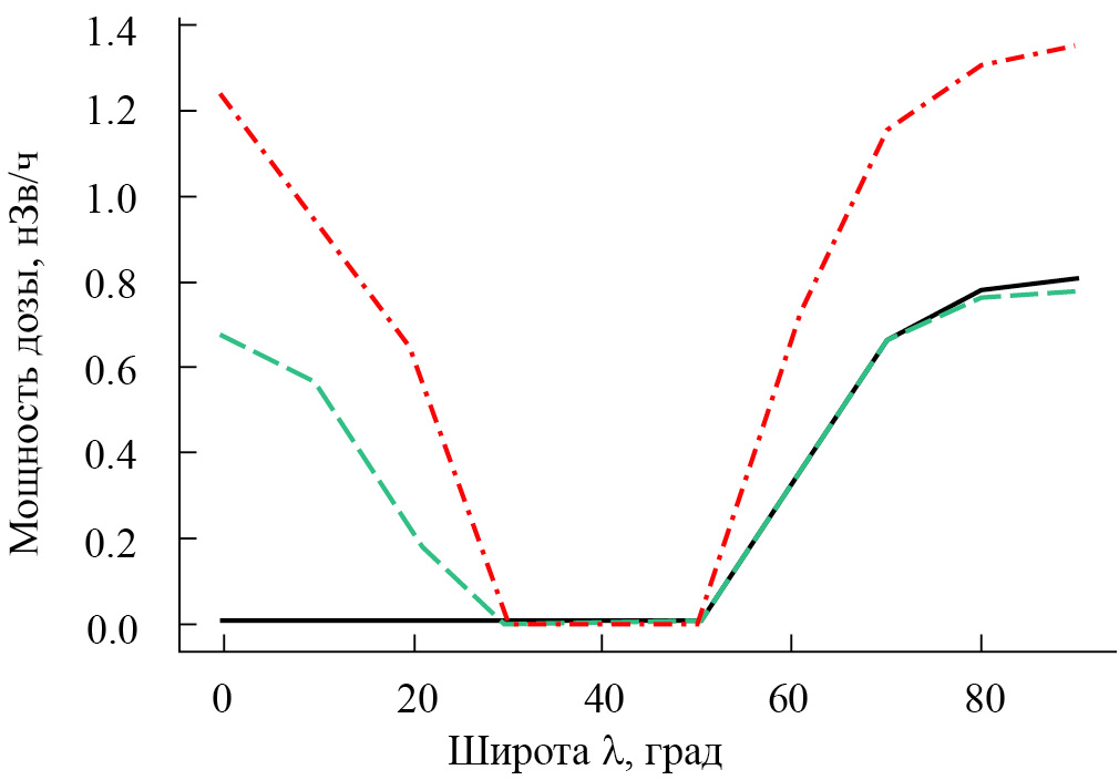 Радиация, которую несут с собой КЛ даже сегодня, при сильном геомагнитном поле, может негативно сказаться на работе высокотехнологичного оборудования, расположенного в районе полюсов. Для того чтобы разобраться, с какими уровнями радиации человечество может столкнуться в момент инверсии, в настоящем исследовании были рассчитаны мощности доз радиации от ГКЛ и СКЛ во время СПС для различных сценариев на ключевых высотах. ГКЛ, обладающие высокой энергией, проходят порог геомагнитного обрезания на всех широтах даже при сильном геомагнитном поле. На рис. 4 приведены мощности доз радиации от ГКЛ в мкЗв/ч в зависимости от широты λ на высоте 10 км, где обычно летают самолеты. Черный график отображает мощности доз радиации для современной эпохи, зеленый – для случая однократной инверсии, красный – для случая множественных инверсий, когда атмосфера разрежена. Из графиков следует, что существенная разница в радиации на этой высоте для обоих сценариев инверсии будет наблюдаться только на низких широтах.