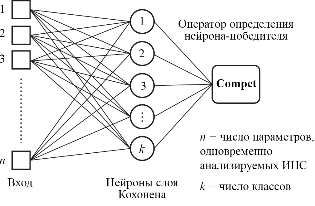 Создаваемая в работе ИНС строится по классическому принципу самообучения. Для решения поставленной задачи классификации была спроектирована и использована самообучающаяся ИНС. Архитектура этой сети построена по принципу слоя Кохонена [10–12] и представлена на рис. 1.