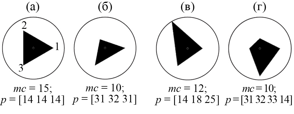 Результатом нейросетевых экспериментов является определение числа классов, которое лучше всего соответствует информации, содержащейся в используемых данных. Классификационные параметры в пределах каждой анализируемой комбинации нормируются, что позволяет представить для нейросети весь массив данных на одной шкале, сохранив информацию об интенсивности событий. В настоящей работе предлагается демонстрация массивов данных с помощью графики в виде многоугольников. Примеры визуализации комбинаций параметров, участвующих в классификации, приведены на рис. 2. Это образы в виде многоугольников. Цифрами на рис. 2а обозначены различные фазы (зарождения, развития и восстановления) суббури, величина радиуса для каждого пика треугольника соответствует относительной длительности фазы. Возможно использовать и комбинацию различных фаз, как например, четырехугольник на рис. 2г.