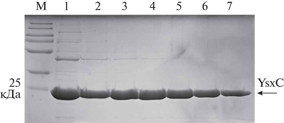 Study of the structures of various biological macromolecules is one of the main directions that are intensively developed using physical methods. Since proteins are an elementary unit of the structural and functional organization of a cell, the strategies for combating pathogenic microorganisms include the analysis of the bacterial protein synthesis apparatus and related systems. The extraction, purification, and small-angle X-ray scattering analysis of the structure of YsxC protein from the Staphylococcus aureus pathogenic bacterium are reported. This protein is involved in the cell growth and division processes, serves an energy-dependent factor, and participates in the assembly of large ribosome subunit. The structural study of this protein opens up a possibility of searching for small molecules capable of inhibiting its function. Since the structural variability of protein factors is higher than that of the conservative ribosome sites, their inhibition makes it possible to selectively affect a pathogenic microorganism.