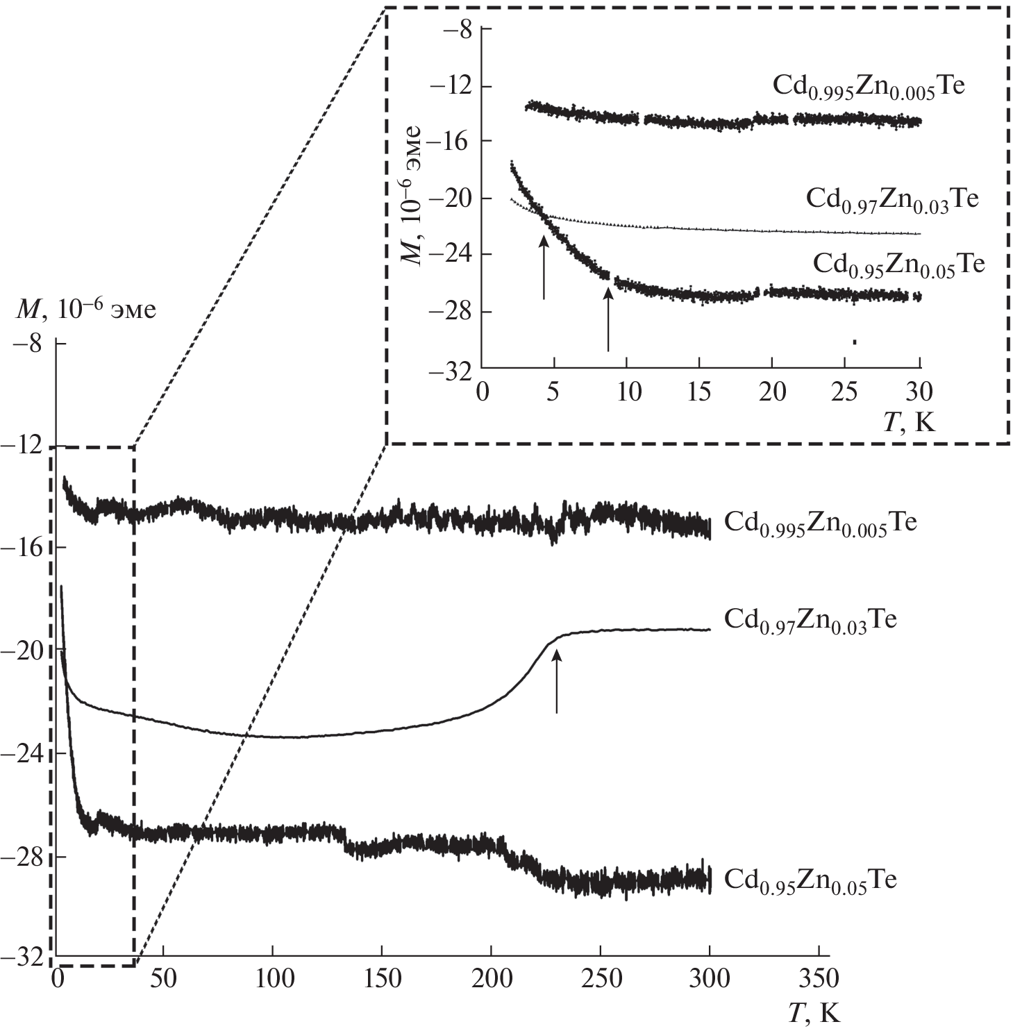 Polycrystalline Cd1–хZnхTe (x = 0.005, 0.03, 0.05) ingots have been obtained by the modified Obreimov–Shubnikov method. The selected single-crystal blocks are studied applying the X-ray diffraction analysis, measurement of electrical characteristics, and magnetometry. The concentration dependence of changes in the magnetic and electrical properties of crystals is investiga11ted. It is established that at Zn concentrations of x = 0.03 and 0.05 ferromagnetic ordering is observed in clusters (inclusions) containing iron and/or nickel at 2 K, which is not observed for Cd1–хZnхTe (x = 0.005) samples.