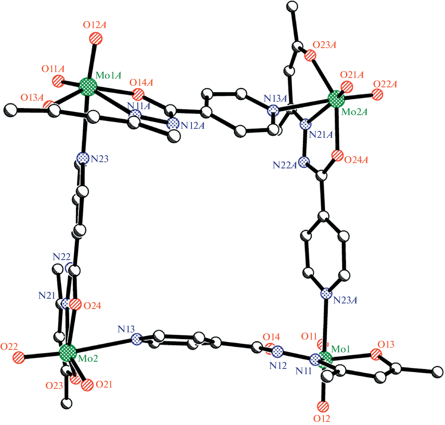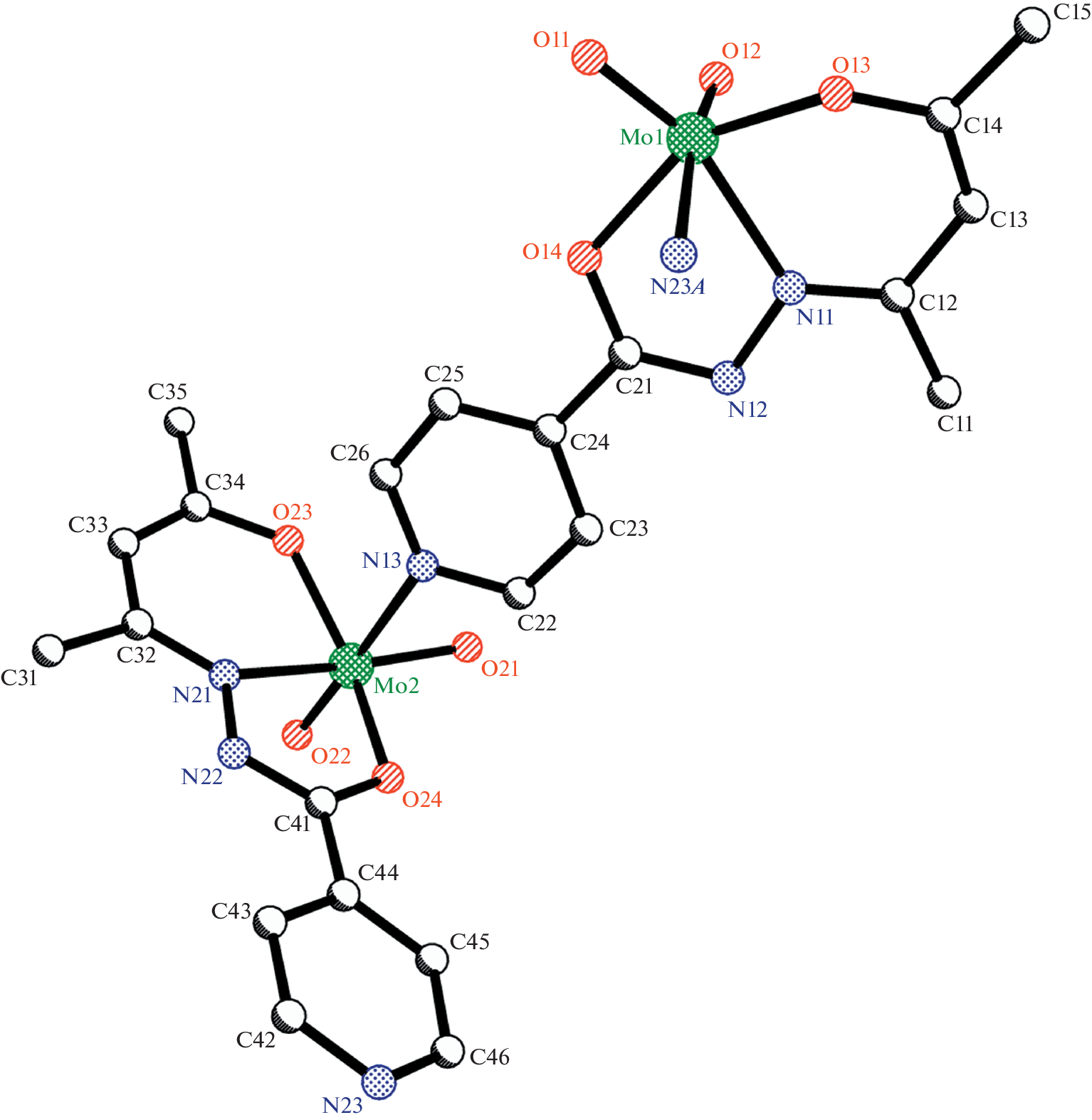determined by X-ray diffraction analysis. The crystal structure is composed of the tetranuclear complexes [МоО2(L1)]4 (Ia) as the structural units lying on crystallographic twofold axes. Both crystallographically independent molybdenum atoms are in a distorted octahedral coordination environment formed by two cis-О(oxo) ligands, two N(L1) atoms of two molecules Ia in trans positions to the О(oxo) ligands, and two О(L1) atoms of one complex molecule in cis positions to О(oxo) and trans to each other. Each (L1)2– ligand is coordinated to two Мо atoms in a tetradentate tridentate-chelating (2О, N) bridging (N) mode. The average bond lengths in complex Iа are as follows: Мо–О(oxo), 1.701 Å; Мо–N(L1), 2.460 (b) and 2.214 Å (c); Мо–О(L1), 1.980 Å. The О(oxo)–МоО–(oxo) bond angle is 105.6°. The ordered dimethylformamide molecule is located in a narrow channel in the structure. The strongly disordered (non-located) solvent molecules (methanol/dimethylformamide/water) occupy wide channels in the structure of I.