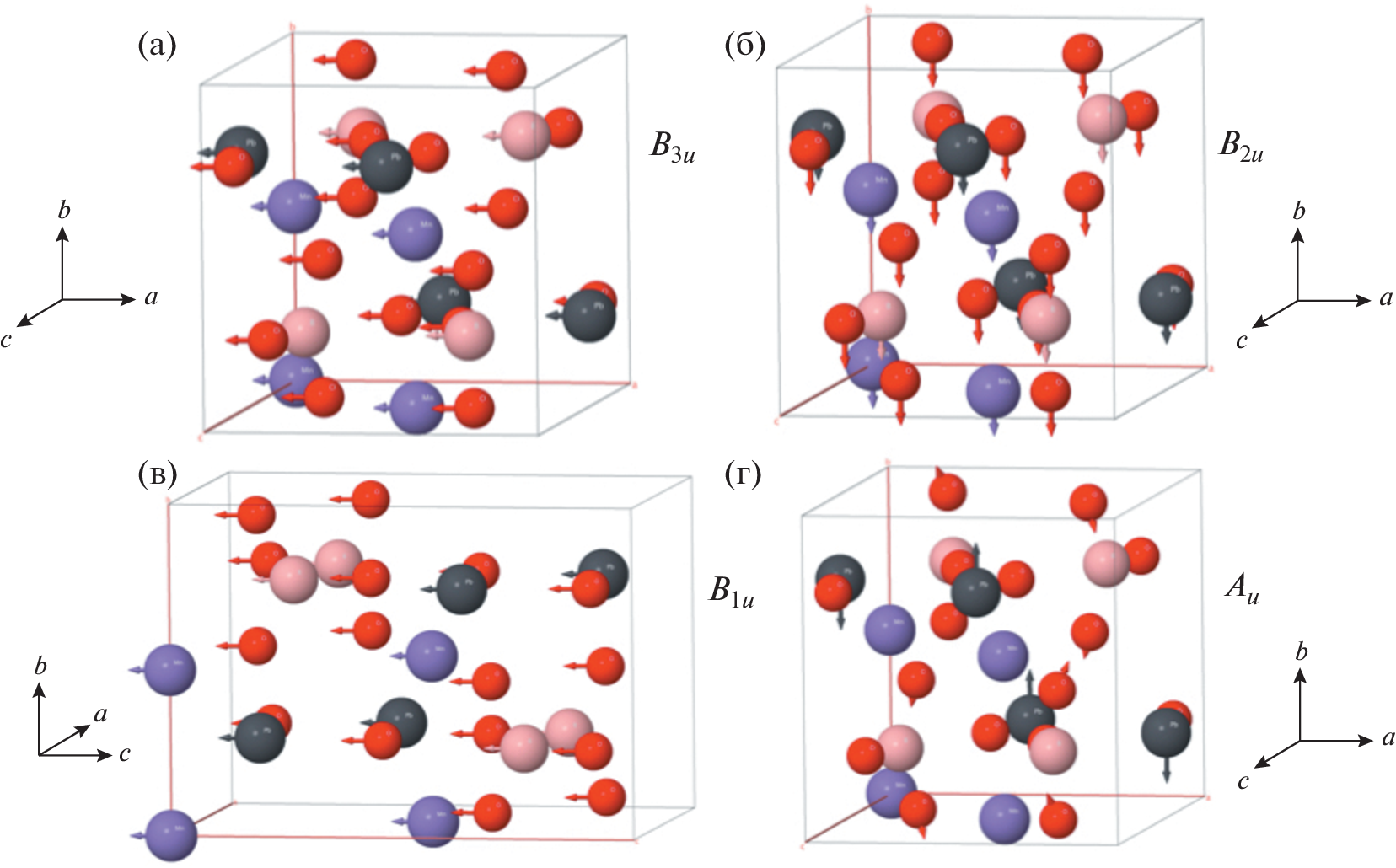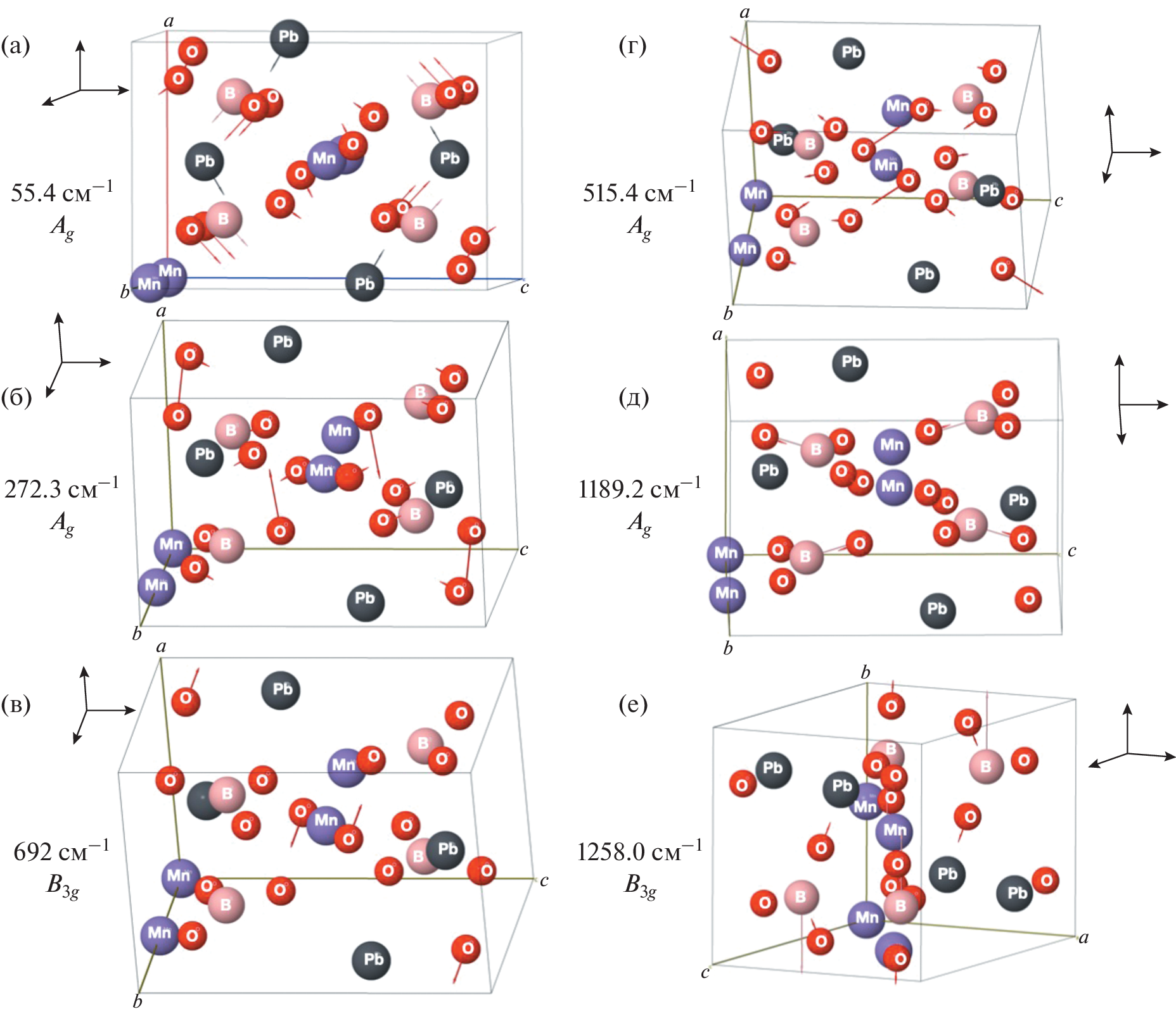 The phonon dispersion and Raman spectrum of the PbMnBO4 ferromagnetic crystal have been calculated within the density functional theory. Imaginary phonon branches have been observed at the points Y, Z, and Г and along the X–S direction of the Brillouin zone, which indicates structural instability and a possible phase transition with variation in external factors (temperature and pressure). The shapes of vibrations and symmetry types of the normal modes of the crystal at the center of the Brillouin zone have been determined. The calculation results are compared with the experimental and theoretical spectra from other studies. It is shown that the vibrational mode of highest intensity at 692.5 cm–1 in the spectrum and the mode at 272.3 cm–1, corresponding to the experimental modes at 690.5 and 224.7 cm–1, are bending vibrations of oxygen atoms in distorted MnO6 octahedra.
