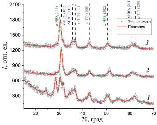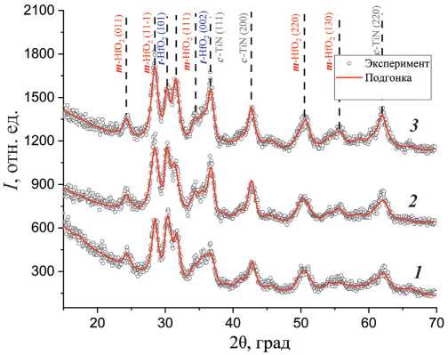 Анализ экспериментальных данных методом Ритвельда проводили с использованием программного обеспечения Material Analysis Using Diffraction (MAUD) [7]. Для расчета подгоночной кривой были взяты структурные файлы из банка данных Inorganic Crystalline Structure Database (ICSD): моноклинная фаза (P21/c) – CCDC № 1624464, тетрагональная фаза (P42/nmc) – CCDC № 1688863, орторомбическая фаза (Pca21) – CCDC № 1629043, кубическая фаза TiN (Fmm) – CCDC № 1761384. Так как во всех известных банках данных отсутствует структурный файл пр. гр. Pca21 для HfO2, был использован структурный файл той же пространственной группы для ZrO2. Такая замена оправдана фактической идентичностью кристаллических решеток Pca21 для HfO2 и ZrO2 и схожестью их дифракционных картин. Также в исходных экспериментальных данных были заранее удалены узкие интенсивные пики от массивной подложки Si для упрощения процесса подгонки.
