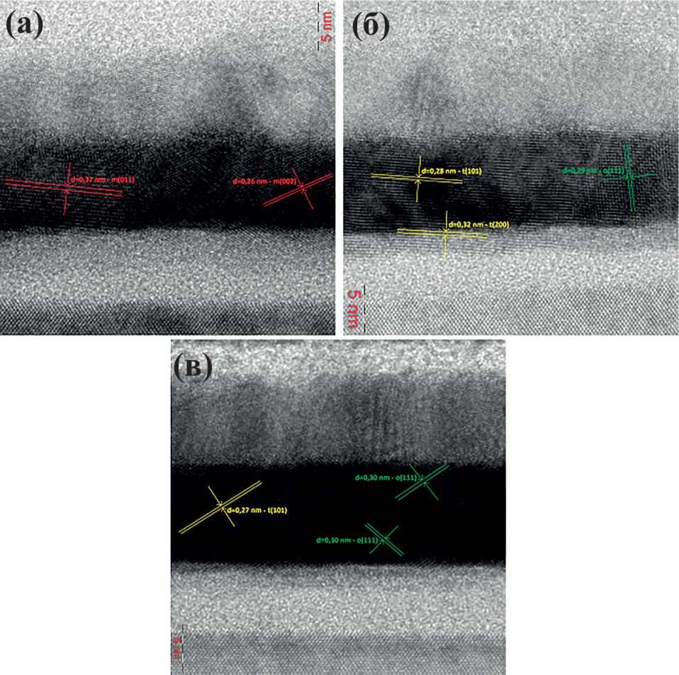 На рис. 4 приведены ПЭМ-изображения беспримесного и легированных Si и Al образцов, отожженных при 1000 и 850°C соответственно. Поскольку на представленных изображениях отчетливо видна кристаллическая структура активного слоя, были рассчитаны межплоскостные расстояния в просматривающихся кристаллитах. Сопоставление полученных данных с табличными значениями межплоскостных расстояний для различных ориентаций трех кристаллических фаз HfO2 (моноклинной, тетрагональной и орторомбической) показало, что в отожженном беспримесном образце просматривается исключительно моноклинная сингония, а образцы, легированные Si и Al, демонстрируют наличие в своей структуре тетрагональной и орторомбической фаз. При этом, если в образце, легированном Si, доминирующей является тетрагональная кристаллическая модификация, то на изображении образца с примесью Al наблюдается большое количество орторомбической фазы.