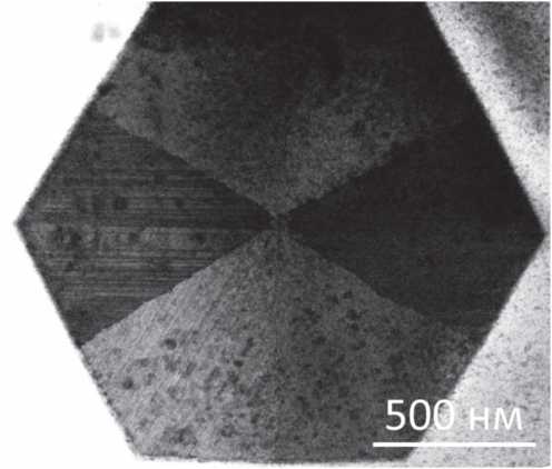 Рис. 4. ПЭМ-изображение тонкой призмы κ-фазы оксида галлия, на котором отчетливо выделяется часть вращательных доменов.