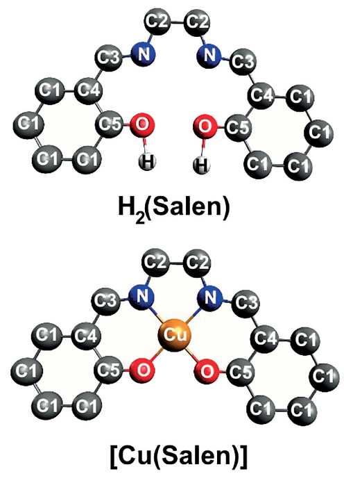 Молекулярный комплекс N, N′-этиленбис(салицилальдимината) меди(II), CuO2N2C16H14, или [Cu(Salen)], состоит из центрального комплексообразующего катиона меди Cu2+, который координирует два атома кислорода и два атома азота саленового лиганда, образуя координационный центр CuN2O2 с точечной группой симметрии C2v. Согласно данным газовой электронографии [9] межатомные расстояния R(Cu–O) = 1.921 Å и R(Cu–N) = 1.927 Å достаточно близки друг к другу, что указывает на практически плоско-квадратное строение координационного центра аналогично комплексу [Ni(Salen)] [10].