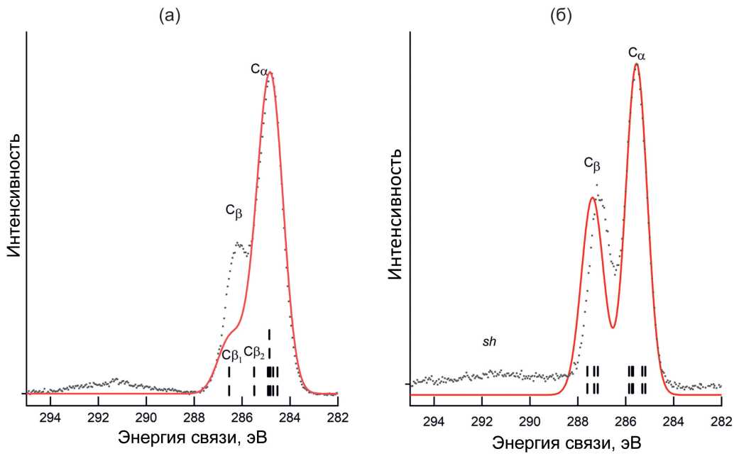 Рис. 2. Экспериментальные РФЭ C1s-спектры (точки) и теоретические спектры (сплошные кривые), построенные на основе данных DFT-расчета для молекулы салена H2(Salen) (а) и комплекса [Cu(Salen)] (б). Вертикальными столбиками обозначены положения рассчитанных значений энергии связи C1s-уровней атомов углерода каждого типа – Cα (C1, С4) и Cβ (С2, С3, С5).