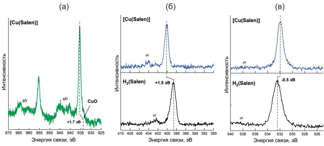 Перейдем к рассмотрению РФЭ Cu2p-спектра комплекса (рис. 3а). Этот спектр состоит из двух спин-дублетных компонент 2p3/2 и 2p1/2, расположенных при энергии связи 935.5 и 955.3 эВ соответственно. Кроме этих основных линий в спектре на расстоянии около 6–10 эВ наблюдаются высокоэнергетические сателлитные полосы. Такие полосы могут возникать в процессе Cu2p-фотоионизации в результате одновременного встряхивания (shake-up) электронной подсистемы атома. Этот многоэлектронный процесс часто приводит к возбуждению валентного электрона и переходу с ВЗМО, локализованных на атоме металла, на нижние вакантные молекулярные орбитали, расположенные на лиганде. Другими словами, процесс Cu2p-фотоионизации сопровождается переносом заряда от атома металла к атомам саленового лиганда [23, 24]. Такие сателлитные пики наблюдаются в РФЭ-спектрах систем с открытой электронной 3d-оболочкой в основном состоянии, например в случае спектров меди, железа, марганца с различными лигандами [23–25]. Наиболее интенсивная Cu2p3/2-компонента в спектре [Cu(Salen)] располагается при энергии примерно на 1.7 эВ больше, чем в спектре соединения CuO (933.8 эВ) [23]. Этот высокоэнергетический сдвиг электронного уровня Cu2p3/2 отражает увеличение положительного эффективного заряда на атоме меди в [Cu(Salen)] по сравнению с CuO за счет участия 3d-электронов атома меди в [Cu(Salen)] в π-связывании с атомами саленового лиганда (кислорода и азота), которое сопровождается переносом 3d-электронной плотности на лиганд (обратное π-донирование) [26].
