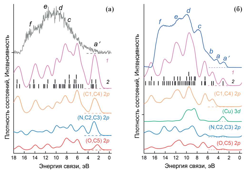 Из сравнения спектров полной и парциальной плотности состояний для H2(Salen) можно сделать вывод, что ВЗМО образуются в результате сильного перемешивания валентных 2pπ-орбиталей атомов лиганда (C, N, O) с доминирующим вкладом 2pπ-орбиталей атомов углерода группы Сα (С1, С4). Эти молекулярные орбитали отвечают за самую низкоэнергетическую полосу фотоэмиссии a'. Согласно расчетам в случае [Cu(Salen)] существенный вклад в ВЗМО (ответственную за полосы a' при 3.0 эВ) вносят π-орбитали атомов координационного центра CuN2O2. Следующие молекулярные орбитали ВЗМО-1 и ВЗМО-2 (ответственные за полосу фотоэмиссии a при 4.3 эВ) образуются за счет ковалентного смешивания (связывания) 2p-орбиталей атомов лиганда (C, N, O) при доминирующем вкладе 2p-орбиталей атомов углерода фенильных колец (группа атомов углерода Сα). В области Ebin ~4.0–4.2 эВ также наблюдается небольшой вклад Cu 3dπ-орбитали атома Cu. Высокоэнергетические полосы f, e и b при Ebin = 14.4, 11.5 и 6.0 эВ соответственно в спектре комплекса отражают в основном молекулярные орбитали, образованные 2p-орбиталями атомов саленового лиганда σ-типа. За полосы фотоэмиссии c и d при Ebin = 9.9 и 7.7 эВ в значительной степени ответственны молекулярные орбитали с заметным вкладом 3d-орбиталей атома Cu и вкладами 2p-орбиталей атомов лиганда. Таким образом, можно заключить, что атомные 3d-орбитали Cu вносят существенный вклад в молекулярные орбитали комплекса [Cu(Salen)] только в диапазонах Ebin 2–4 и 6–11 эВ. Такое широкое энергетическое распределение занятых молекулярных орбиталей (2–11 эВ) с вкладами атомных 3d-орбиталей Cu можно объяснить низкой симметрией молекулярного комплекса.