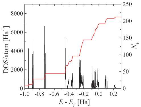 Рис. 4. Плотность электронных состояний (собственных значений системы уравнений Кона–Шэма) на атом dN(E)/nadE для сверхъячейки, используемой в качестве модели сегнетоэластической фазы. Здесь N(E) – число состояний с энергией, не превышающей E. Для функции N(E) справедлива нормировка , где EF – энергия Ферми, na = 30 – число атомов в структурной единице Z = 2 (K4Ba2(NO2)8), а Ne = N(EF) = 192 – число валентных электронов в данной структурной единице.