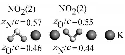 Характер сегнетоэластического ФП при 420 K ставит вопрос о правильности интерпретации данных РСА для параэластической фазы [11]. Поскольку в результате ФП типа порядок–беспорядок происходит только ориентационное упорядочение в группе NO2(2), то взаимные расположения атомов этой группы в пара- и сегнетоэластической фазе не должны сильно различаться. Однако из приведенных в этой работе структурных данных для парафазы следует, что позиции атомов N(2) и O(2) находятся в одной плоскости с атомами K (z/c = 0.5). Отметим, что нитритные группы являются довольно жесткими, и искажения угла между азот-кислородными связями в структуре [11] являются энергетически невыгодными. Данное противоречие можно разрешить в рамках альтернативной интерпретации результатов [11], согласно которой найденные позиции атомов N(2) и O(2) являются результатом статистического усреднения по двум ориентациям групп NO2(2) с противоположным направлением дипольного момента (параллельного оси z). Для проверки этого предположения была выполнена оптимизация положений атомов в 60-атомной сверхъячейке, в которой начальные положения атомов N(2) и O(2) находились в одной плоскости. Однако, как показали расчеты, данные позиции оказались неустойчивыми, в результате минимизации энергии атомы смещались в положения, показанные на рис. 5. Таким образом, данные Петрашко отвечают не реальным позициям атомов N(2) и O(2) в элементарной ячейке, а их усредненным значениям.
