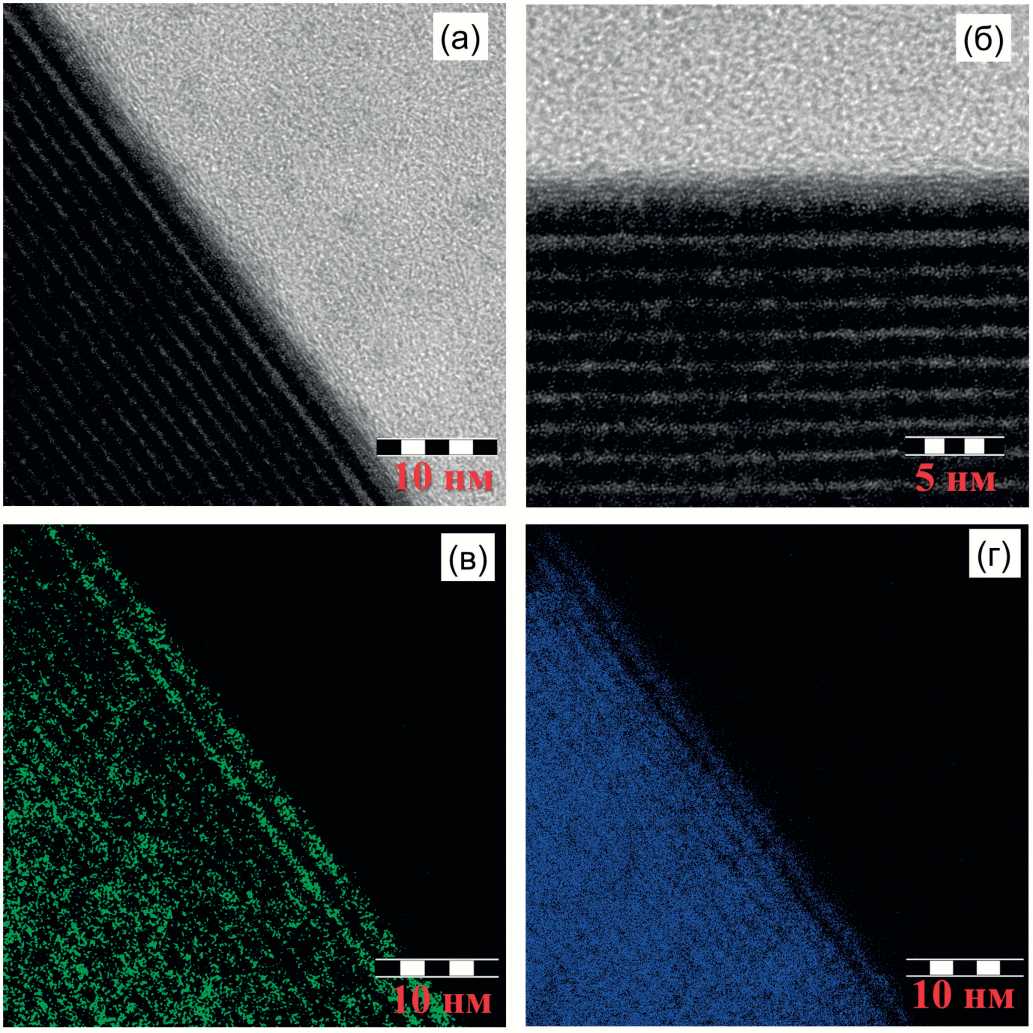 Рис. 1. Изображения образца Si/[Cr/Sc]200, полученные методами ПЭМ с разным увеличением (a, б) и электронной спектроскопии на L-крае поглощения Sc (в) и Cr (г).