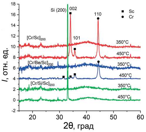 Отсутствие каких-либо пиков на дифрактограммах МРЗ Si/[Cr/Si/Sc]200, отожженного при 350 и 450°C (рис. 3), позволяет констатировать, что на протяжении всего отжига оба слоя сохраняют аморфное состояние. Можно сделать вывод, что барьерный слой Si препятствует перемешиванию слоев и их последующей кристаллизации.