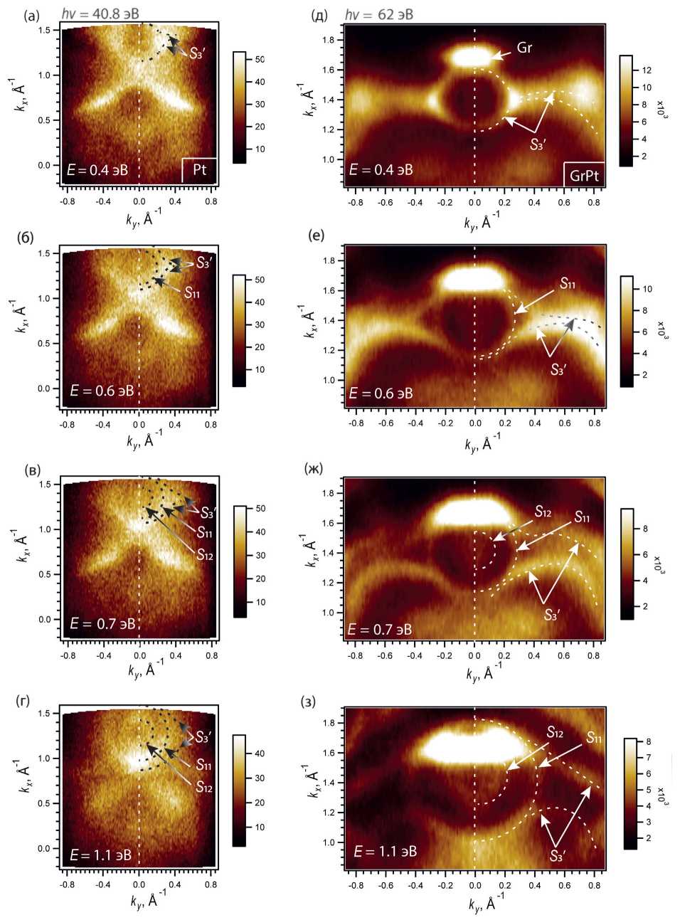 На рис. 2 представлены данные ФЭСУР для чистой поверхности Pt(111) (а–г) и для поверхности Gr/Pt(111) (д–з), полученные при энергиях фотонов 40.8 и 62 эВ соответственно. На срезах, полученных из ФЭСУР-карт при энергиях связи 0.4, 0.6, 0.7 и 1.1 эВ в области точки поверхностной зоны Бриллюэна Pt(111), пунктирными линиями отмечены поверхностные S´3, S11, S12 состояния платины. Данные состояния, наблюдавшиеся ранее в [7–11], обозначены здесь и далее как в [7]. На срезе при энергии связи 0.4 эВ, наиболее близкой к уровню Ферми (рис. 2a, 2д), в обеих системах наблюдаются только зоны, соответствующие поверхностному состоянию S´3. При увеличении энергии связи на 0.2 эВ на срезах (рис. 2б, 2е) наблюдаются поверхностные состояния S11, которые образуют в своем сечении окружность. При 0.7 эВ наблюдаются состояния S12 (рис. 2в, 2ж), также образующие в сечении окружность, имеющую тот же центр, что и S´3 и S11. При энергии связи 1.1 эВ (рис. 2г, 2з) состояния S´3 практически исчезают, остаются только S11 и S12.