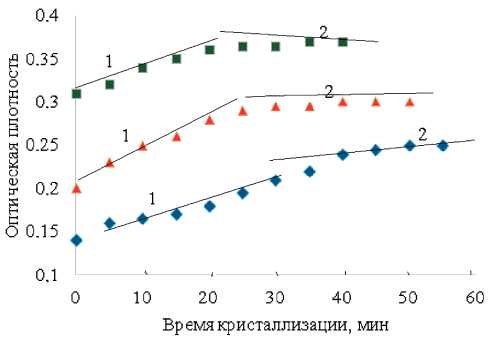 Рис. 1. Зависимость оптической плотности модельного раствора от времени кристаллизации при пересыщении S = 1.5 (ромбы), 2.0 (треугольники), 2.5 (квадраты): 1 – рост образовавшихся частиц; 2 – рост, агрегация и агломерация частиц.