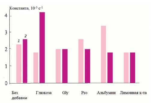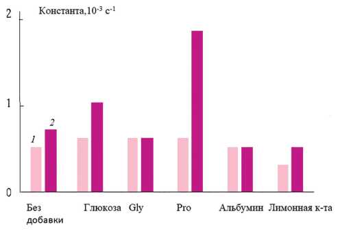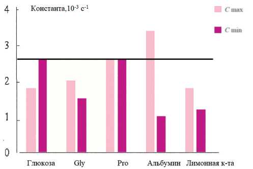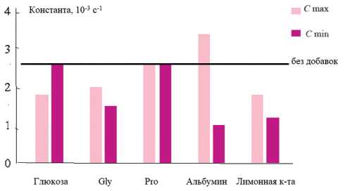 Для выявления влияния концентрации органических добавок на кинетику кристаллизации построены диаграммы констант скорости реакции для минимальной и максимальной концентраций примесей (рис. 4).