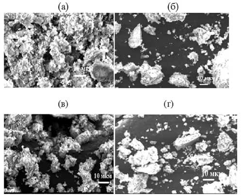 Рис. 5. РЭМ-изображения (1000-кратное увеличение) полученных образцов чистого гидроксилапатита (а) и в присутствии альбумина концентрацией 5 (б), 7 (в), 10 г/л (г).