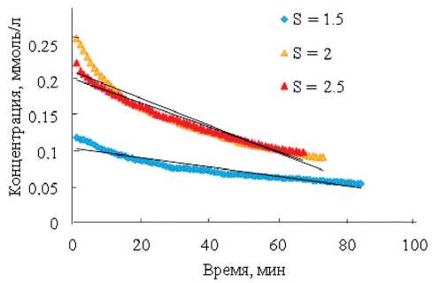 Для изучения частных кинетических характеристик в отношении ионов кальция были получены временные зависимости концентрации ионов в процессе кристаллизации при пересыщении S = 1.2, 2.0, 2.5 (рис. 7). Для количественной интерпретации полученных данных определены порядок и частная константа реакции кристаллизации (табл. 7).