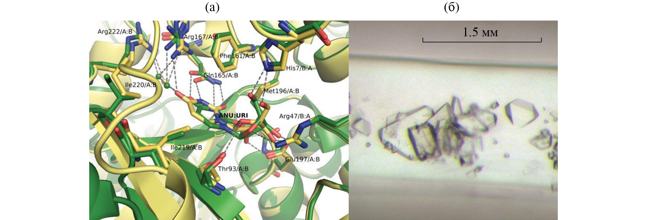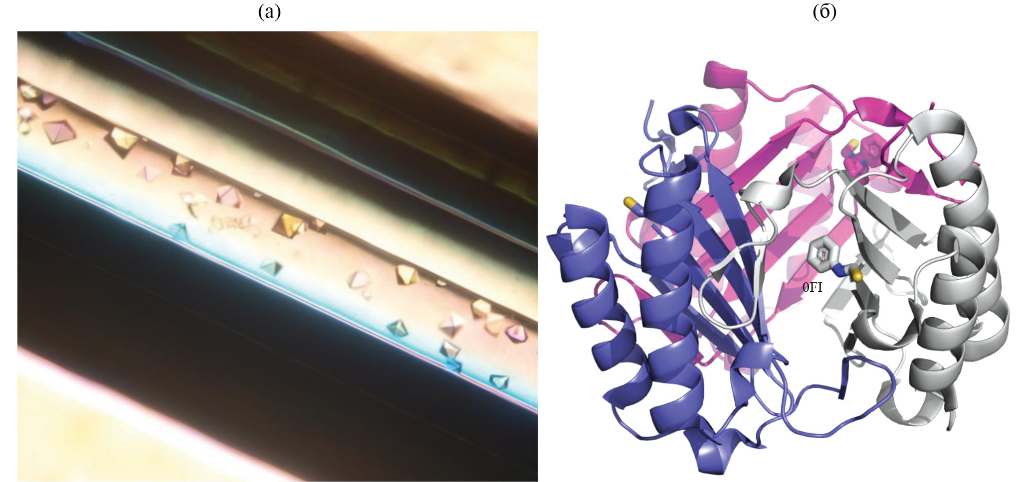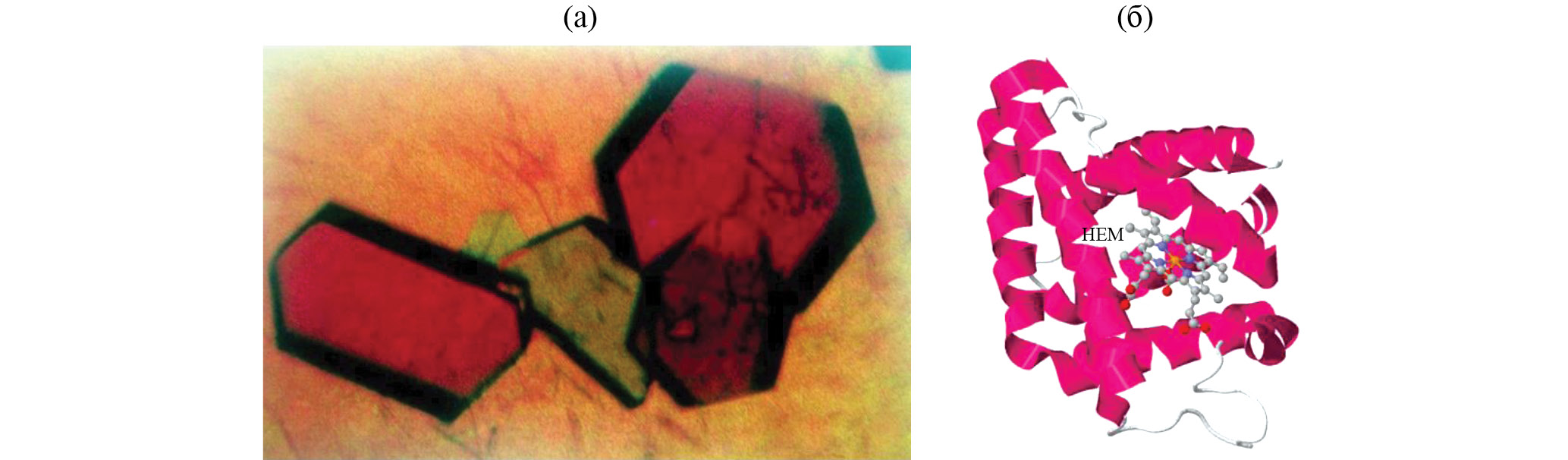 Рис. 1. Кристаллы (а) и структура (б) леггмоглобина (PDB ID: 1LH1)