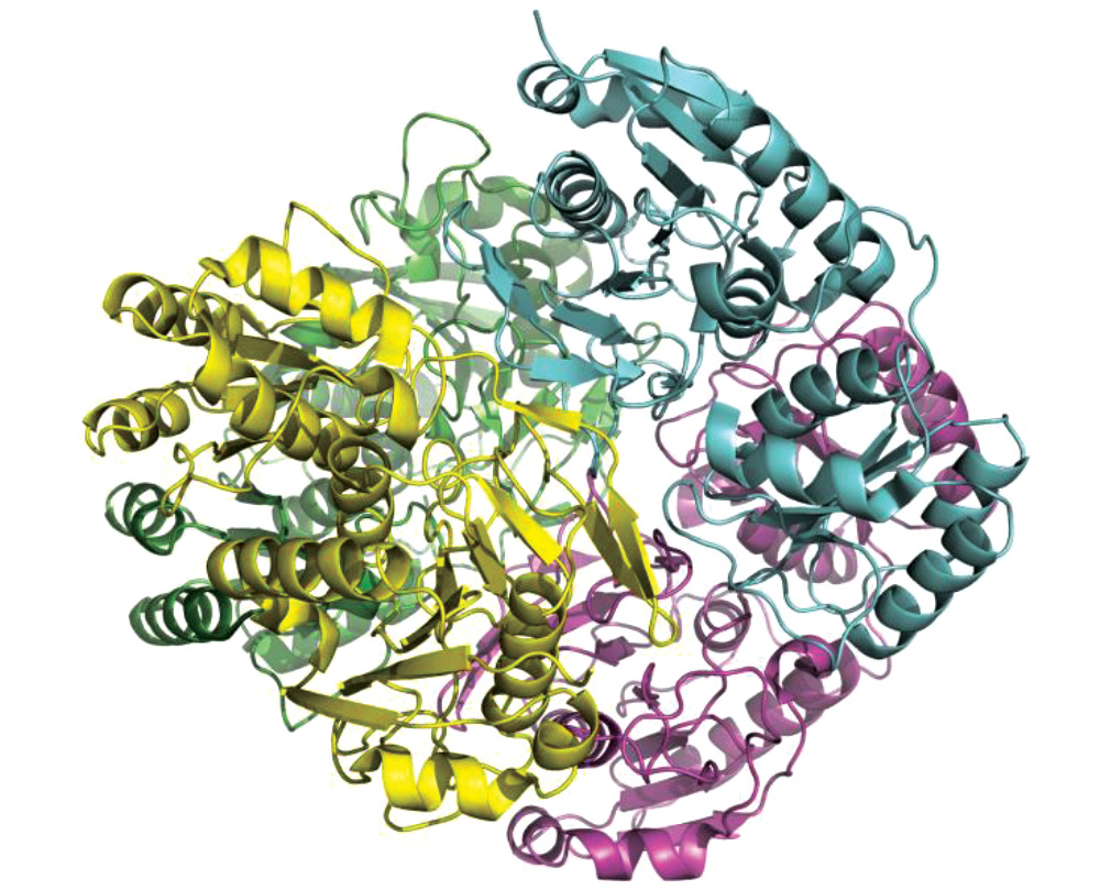 Аспарагиназа Erwinia carotovora имеет высокую противоопухолевую активность, низкую токсичность и в течение ряда лет успешно применяется при лечении острой лимфобластной лейкемии. Структура апоформы фермента была определена при разрешении 3 Å (рис. 2), структура комплексов с L-аспарагиновой и L-глутаминовой кислотами – при разрешении 1.9 и 2.2 Å соответственно [42, 43]. Описана укладка полипептидной цепи в субъединицах тетрамерной молекулы фермента, локализованы активные центры. Описаны конформационные изменения, сопровождающие связывание продуктов реакции. Показано, что ключевые аминокислотные остатки (а. о.) активного центра, треонин и тирозин, находятся в подвижной петле и сближаются друг с другом при образовании закрытой каталитически активной формы в результате перемещения подвижной петли, происходящего при связывании субстратов. Было показано, что в связывании обоих продуктов реакции участвуют одни и те же а. о. активного центра, но расположение большего по размеру лиганда – глутаминовой кислоты относительно каталитически важных остатков менее благоприятно для протекания реакции.