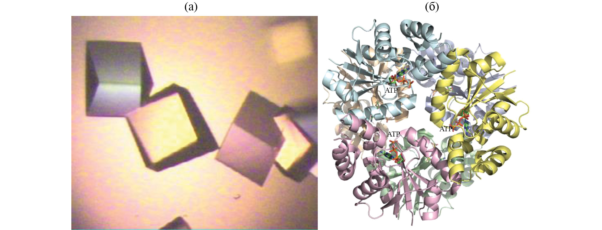 Рис. 5. Кристаллы (а) и пространственная структура (б) фосфопантетеин аденилилтрансферазы Mycobacterium tuberculosis в комплексе с АТФ (ATP, PDB ID: 3UC5)